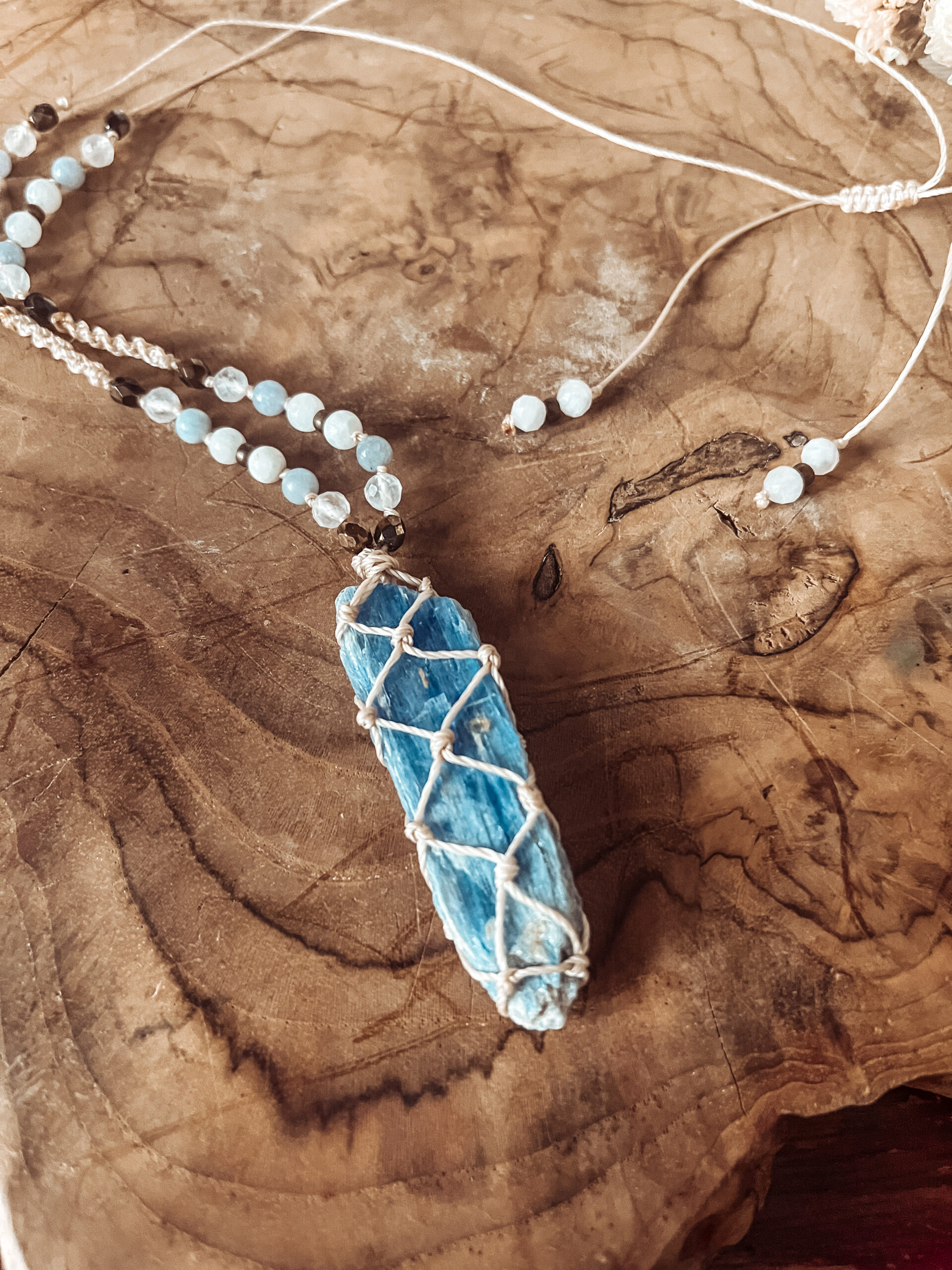 Sercem amuletu jest dysten. Jego nazwa pochodzi od greckiego słowa, którym jest „dis” oznaczający „podwójny” oraz „sthenos” czyli „siła”. Dysten wspiera w tym amulecie obecność kryształów księżycowych i awenturynu. Dysten jest nieregularną, surową bryłą. Możliwe jest kruszenie się kamienia ze względu na jego naturalne właściwości. A jeśli podążać za wierzeniami, jeśli kamień pęknie, oznacza to, że spełnił swoją funkcję ochronną i nie jest już potrzebny w danej chwili.